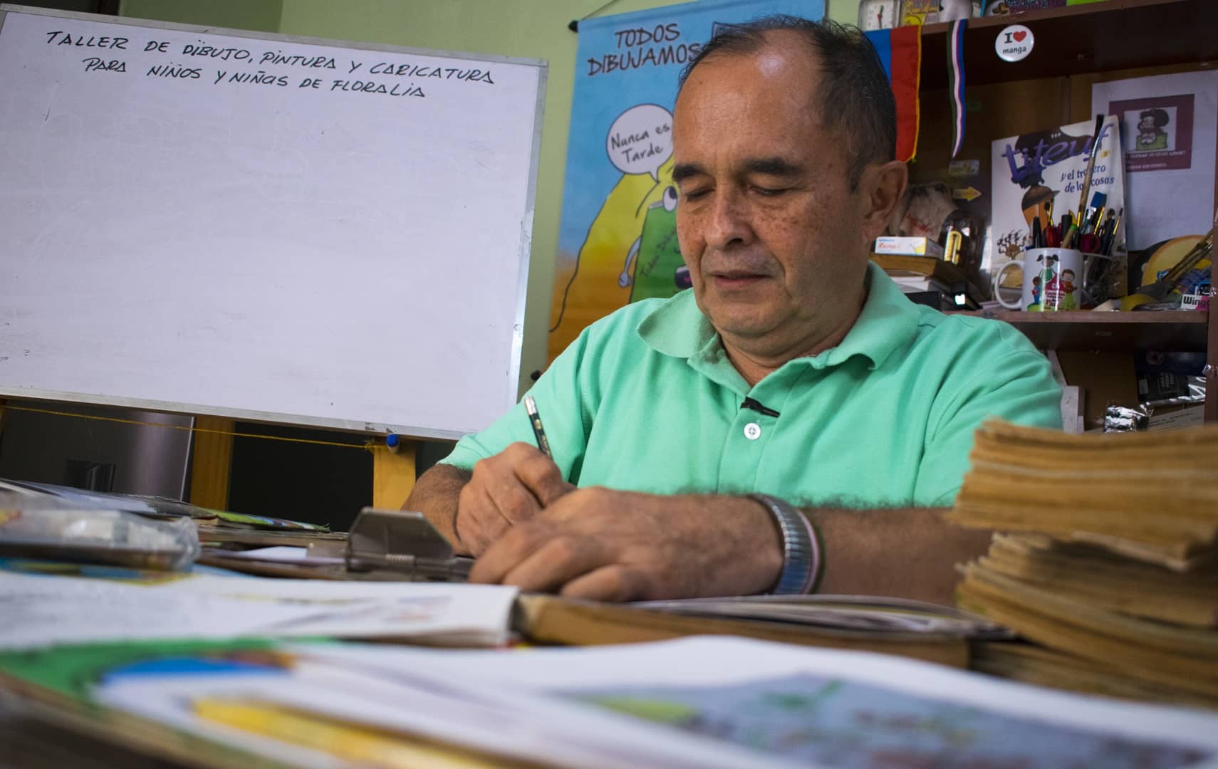 Carlos Alberto Castañeda Arcila, artista plástico mejor conocido como “ACEKAS” por sus caricaturas e historietas, y creador de la fundación PARTE DE TI en Cali, capacita a los niños de Floralia 1, sector 2 en dibujo y pintura desde hace ocho años aproximadamente.