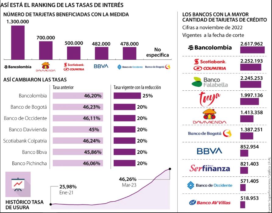 En medio de la elevada inflación que afecta la economía de los colombianos, al menos siete bancos, Banco Davivienda, Banco Pichincha, BBVA, Scotiabank Colpatria, así como las entidades financieras del Grupo Aval, Banco de Occidente y Banco de Bogotá, han iniciado una verdadera «guerra de tasas» mediante la reducción del costo de las tarjetas de crédito. Esta medida ha sido tomada en un momento en que la tasa de usura ha alcanzado un máximo de varios años, situándose en 46,26%, mientras que el Banco de la República trata de combatir la inflación, que ha alcanzado cifras históricas desde 1999.