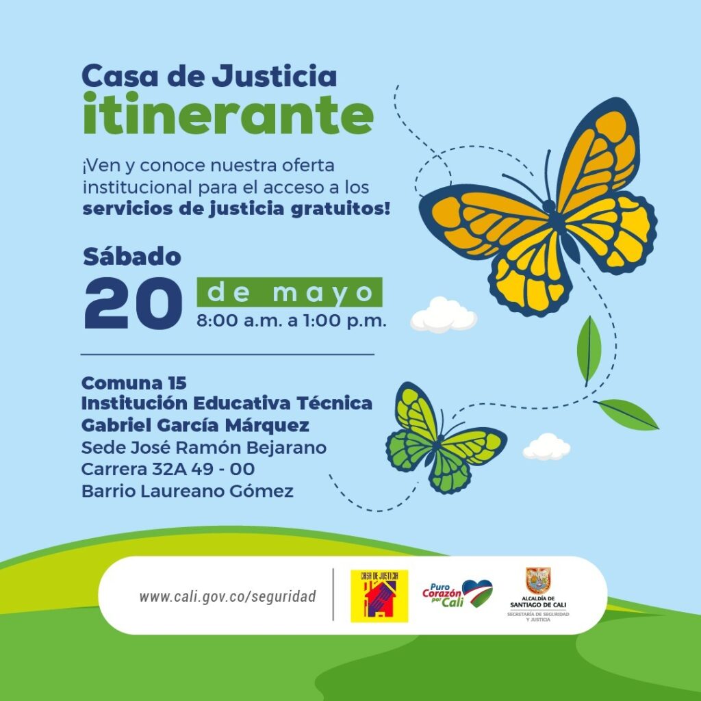 Este sábado 20 de mayo, a partir de las 8:00 de la mañana, se llevará a cabo en la Institución Educativa Técnica Gabriel García Márquez, sede José Ramón Bejarano, ubicada en la carrera 32A N° 49-00 del barrio Laureano Gómez, comuna 15, la Secretaría de Seguridad y Justicia retomará las Casas de Justicia Itinerante en los diferentes sectores de Cali.