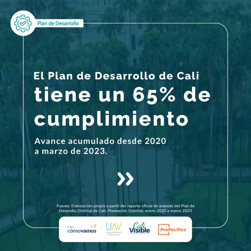 En referencia al progreso acumulado de tres años y tres meses de gestión administrativa, se ha informado que se ha logrado una eficacia o avance del 65%. Aunque en el tercer año de gobierno se esperaría alcanzar avances cercanos al 75%, solamente dos de las cuatro dimensiones estratégicas logran cumplir este nivel de ejecución: específicamente, la dimensión social. “Cali, Solidaria por la Vida” y la dimensión institucional “Cali, Gobierno Incluyente”. Las dos dimensiones restantes se encuentran por debajo de 57% de cumplimiento: la dimensión económica “Cali, Inteligente para la vida” (56,7%) y la dimensión ambiental “Cali, Nuestra casa común” (55,1%).