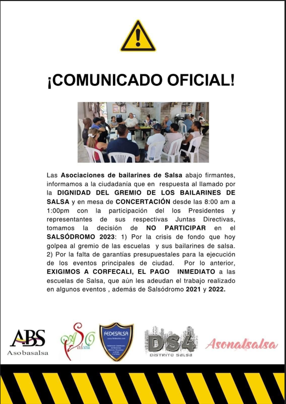 Las asociaciones de bailarines de salsa que han firmado abajo, están notificando al público que en respuesta a un llamado que aboga por la dignidad de la comunidad de bailarines de salsa, y después de una reunión de negociación que tuvo lugar desde las 8:00 a.m. hasta la 1:00 p.m. con la participación de los presidentes y representantes de las respectivas juntas directivas, han tomado la decisión unánime de no participar en el Salsódromo 2023. Este mensaje está plasmado en la carta.