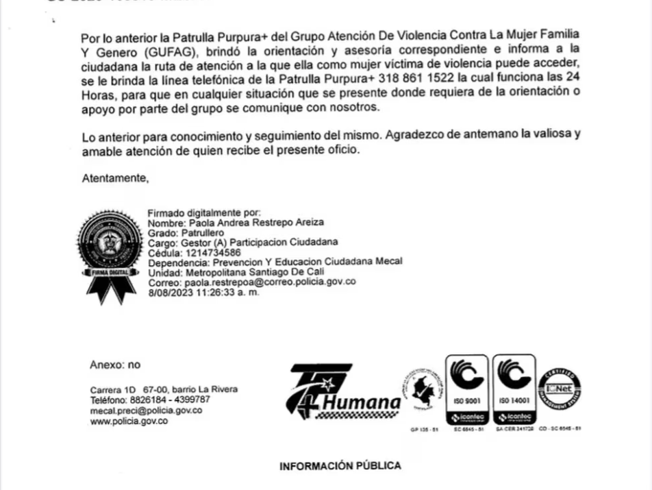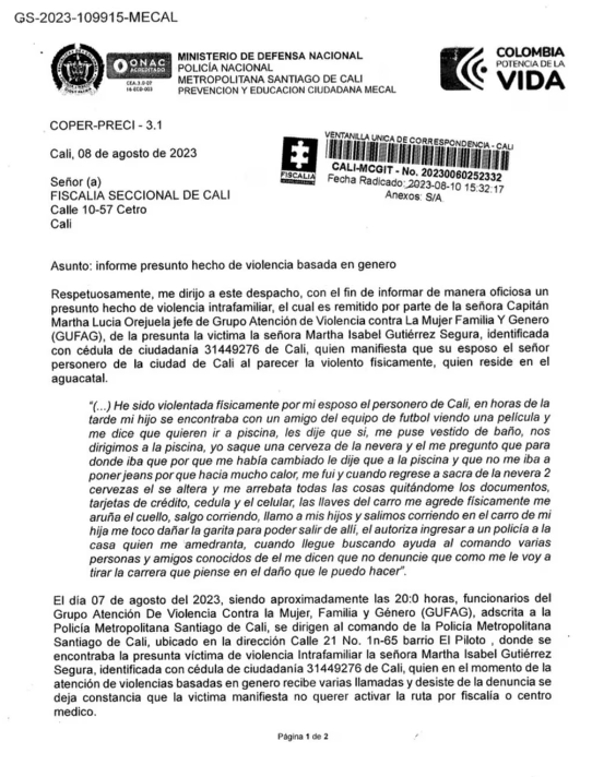 El informe es enviado por la capitán Martha Orjuela, líder del equipo de atención a casos de violencia contra la mujer en Cali. Ella presentó la denuncia ante la Fiscalía General de la Nación. Aún no se ha emitido un comunicado oficial por parte de las autoridades en relación a los hechos.