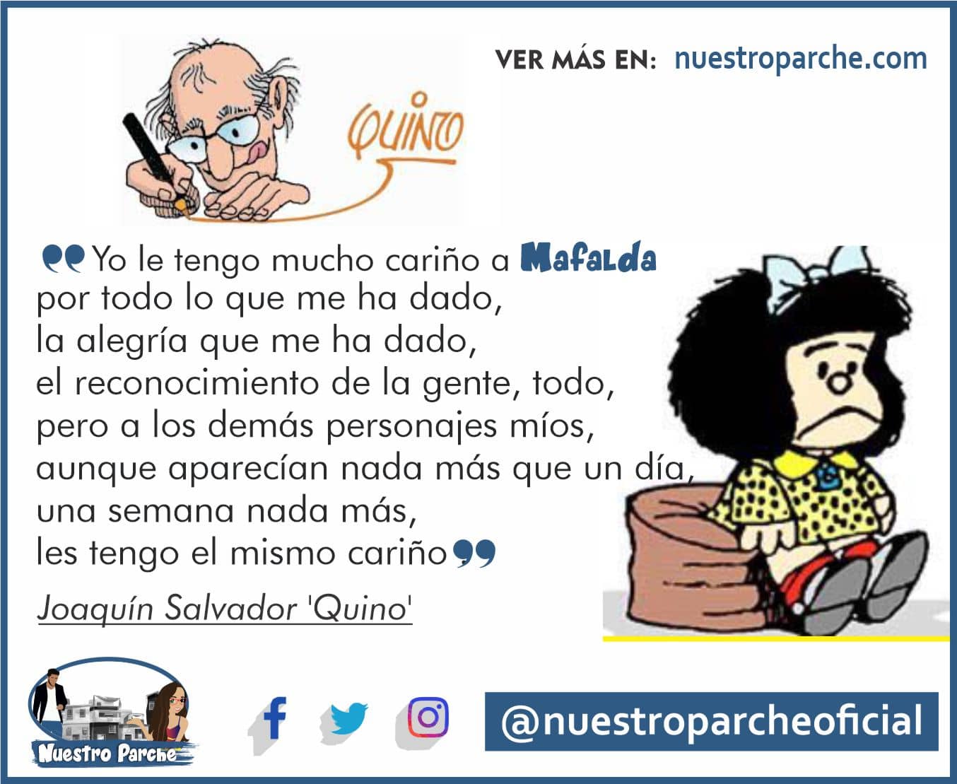 «Yo le tengo mucho cariño a Mafalda por todo lo que me ha dado, la alegría que me ha dado, el reconocimiento de la gente, todo, pero a los demás personajes míos, aunque aparecían nada más que un día, una semana nada más, les tengo el mismo cariño». En una entrevista con CNN en español en 2012, Quino se definió como “un periodista que dibuja”.